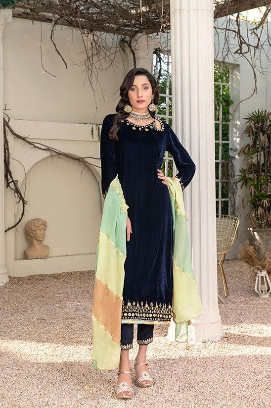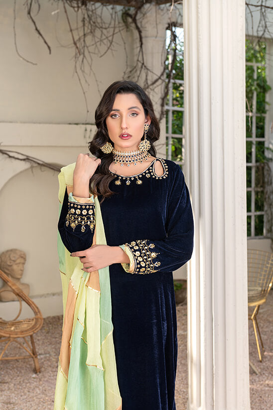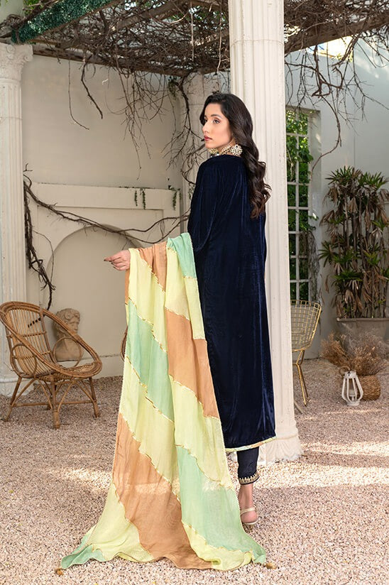 This elegant royal blue velvet straight shirt is beautifully adorned with handwork featuring gotta, tilla, and dabka embroidery on the neckline, sleeves, and daman, creating a regal and intricate design. The shirt exudes sophistication and charm. It comes with straight silk trousers featuring a velvet patti for a sleek appearance. The silk dupatta in pastel colors is adorned with gotti and tassel finishing, making it a complete ensemble perfect for special occasions and events.