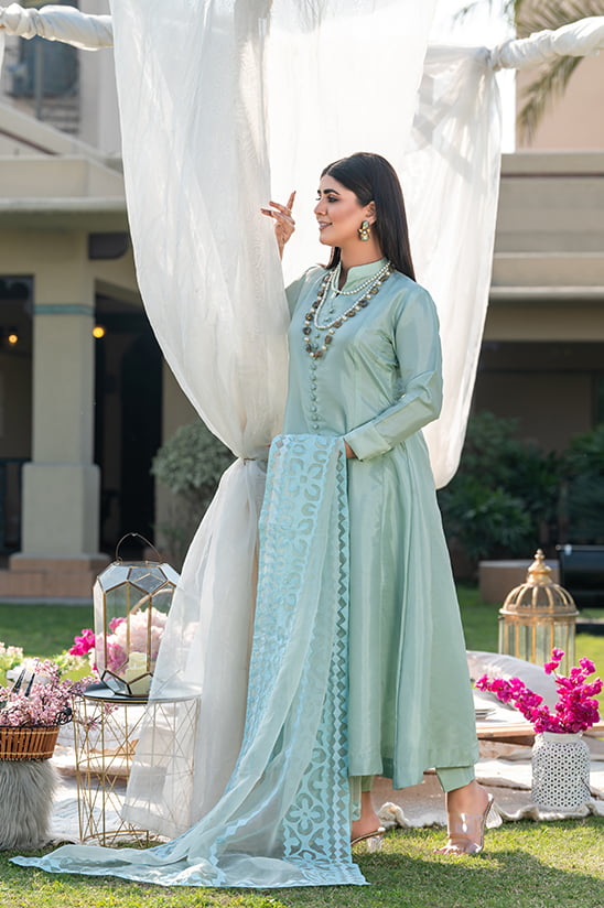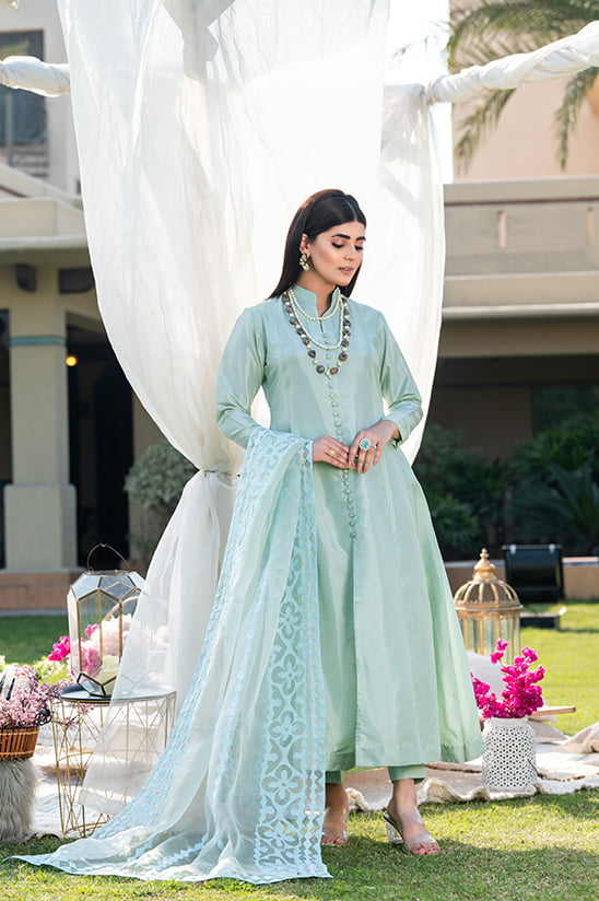This Beautifully designed Katan Silk Dress with Kalian , Silk Buttons and Front Open style represents the true essence of royal looks. It is a perfect attire for a semi- formal festive gatherings. Its unique cuts and style has been carefully managed to give you a smart look. It comes with Katan Silk Trouser and Hand Made Rili Work Dupptta on Organza.