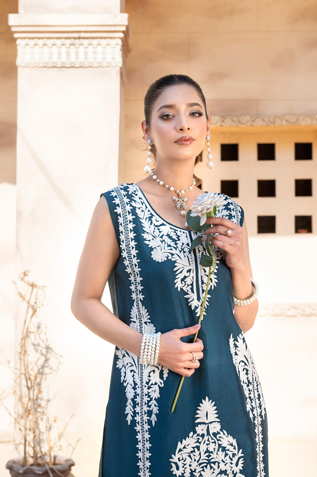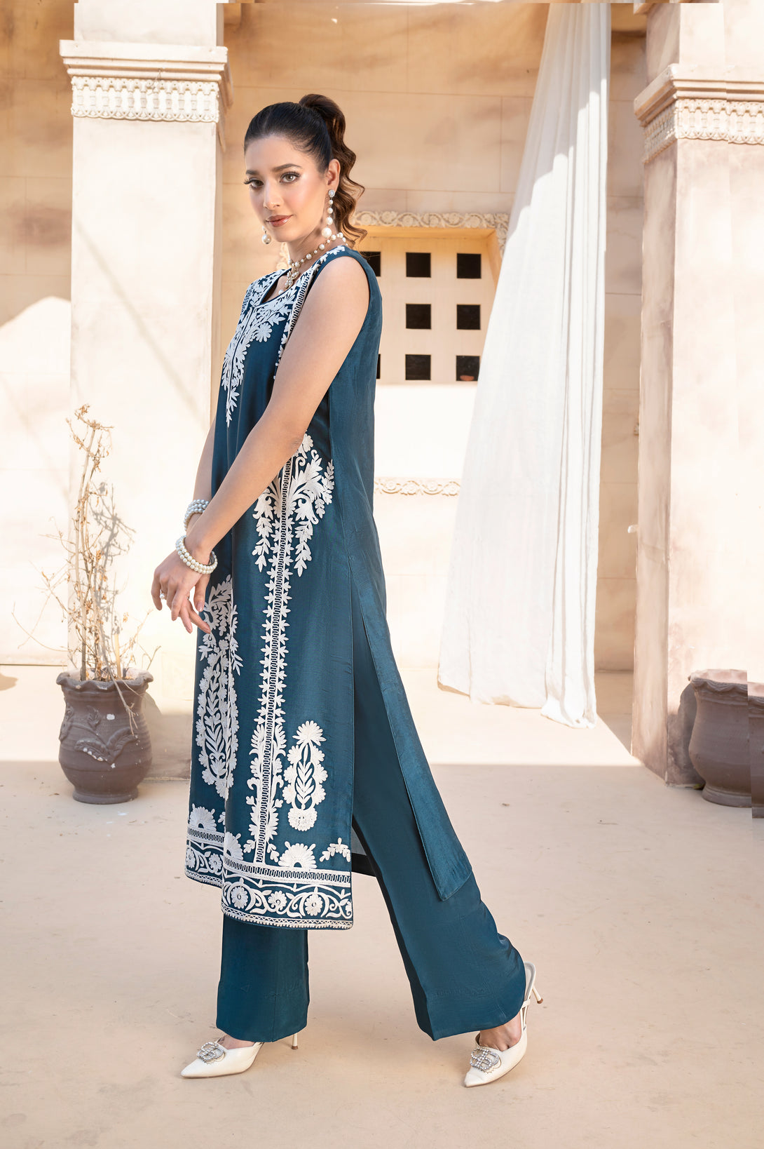 Hazal is a graceful silk ensemble that embodies understated elegance. The silk shirt is adorned with delicate white aari embroidery all over, creating a refined and timeless texture that enhances the soft flow of the silhouette.