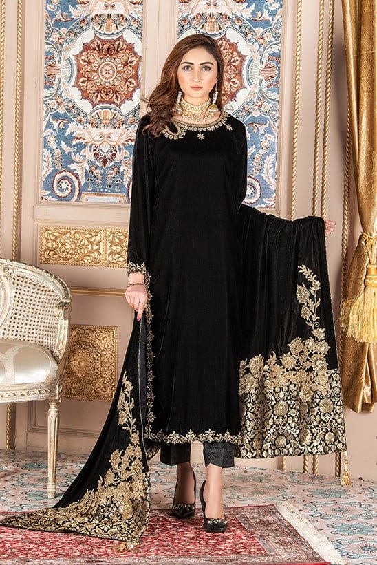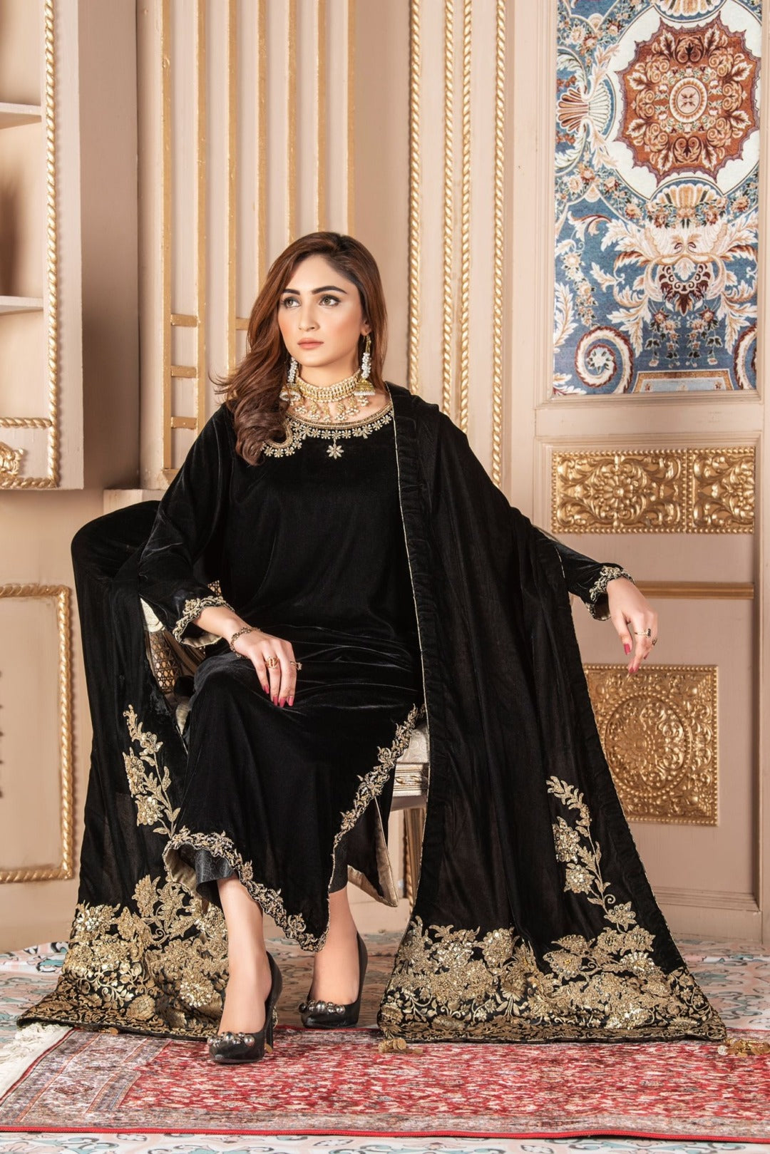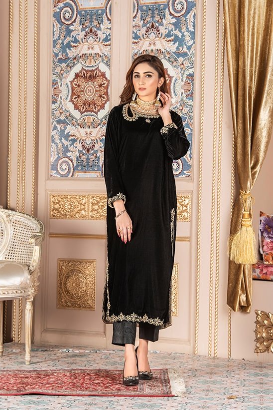 Amply your style game with this loop designed tila work neckline on black velvet kurti shirt paired with elegant black toned trouser . Add beautiful velvet shawl with detailed tila work on borders.
