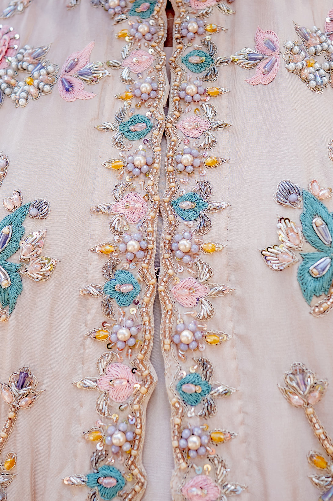 Exuding grace and sophistication, Mahjabeen is a timeless creation in a soft baby pink hue, designed to celebrate femininity with elegance. The ensemble features a long front-open silk gown, meticulously hand-embellished with resham, tilla, dabka, and cut dana work, creating a delicate yet intricate pattern that reflects fine artistry.